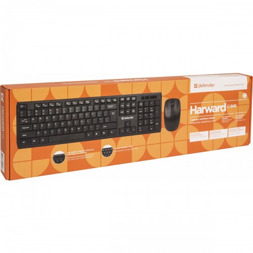 Defender Harvard C-945 Nano - это неприхотливый, надежный и легкий в использовании комплект. Классическая печатная раскладка клавиатуры содержит символы латиницы. Беспроводная мышь черного цвета с 3-мя кнопками, колесом прокрутки и интерфейсом подключения nano-приемника через универсальный порт USB.