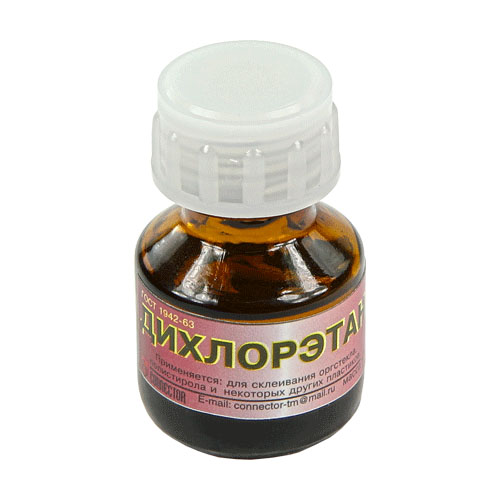 Дихлорэтан - прозрачная ядовитая жидкость. Чтобы дихлорэтан стал клеем, в нем необходимо растворить 10% полистирола или 2% оргстекла (плексигласа). Предназначен для склеивания корпусной пластмассы из полистирола и оргстекла. Не применять для склеивания пищевой посуды.
