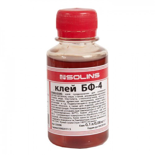 Клей БФ-4 представляет собой раствор поливинилбутираля с резольными фенолформальдегидными смолами в растворителе (абсолютированный этанол). Разрешен для эксплуатации в диапазоне -60°С…+80°С. Не гниет, не подвергается коррозии, устойчив к химическим кислотам, бензину и маслам. Имеет желтый оттенок и густую консистенцию.