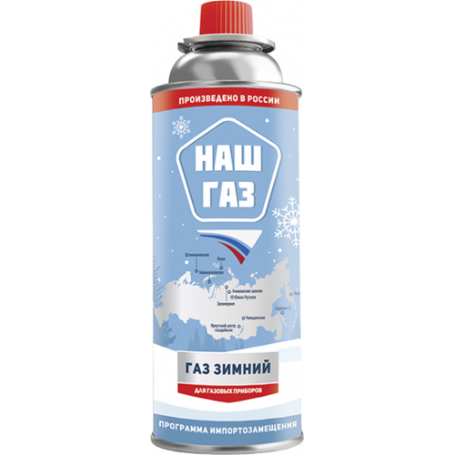 Одноразовый газовый баллон (картридж) для газовых горелок (резаков), обогревателей, портативных плит и ламп со смесью более стабильно работающей в условиях низких температур. Баллоны «Наш газ» могут использоваться круглогодично. Они компактны, абсолютно безопасны и имеют оптимально подобранный состав с высокой степенью очистки от примесей. Отлично работают на морозе, характеризуются экономичным расходом, например, для обогрева палатки в холодную погоду и приготовления полноценного обеда.