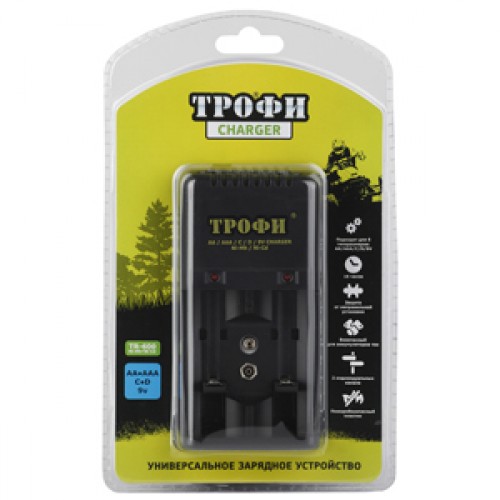 Универсальное зарядное устройство для 1 или 2 аккумуляторов типоразмеров АА, ААА, C, D или 1 на 9V (крона). Ток заряда 200мА (25мА для кроны), два индивидуальных канала, время заряда для аккумуляторов АА 2500мАч - 16,5 часов, ААА 950мАч - 6,5 часов. Пожаробезопасный пластик. Защита от неправильной установки. LED-индикатор подключения.